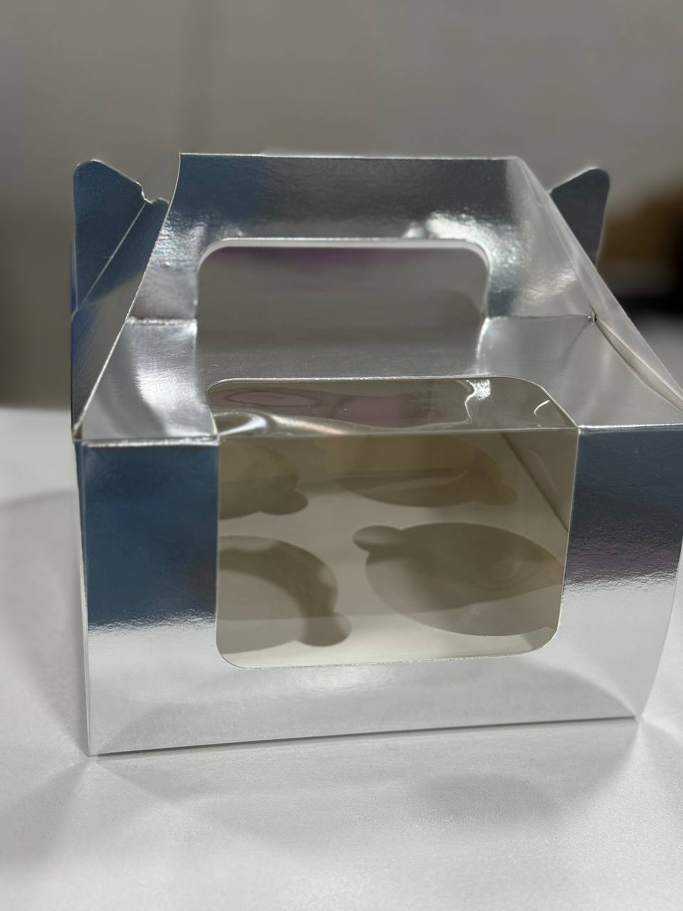 Коробка для капкейков 4 шт с окошком 160*160*195 мм (серебро)