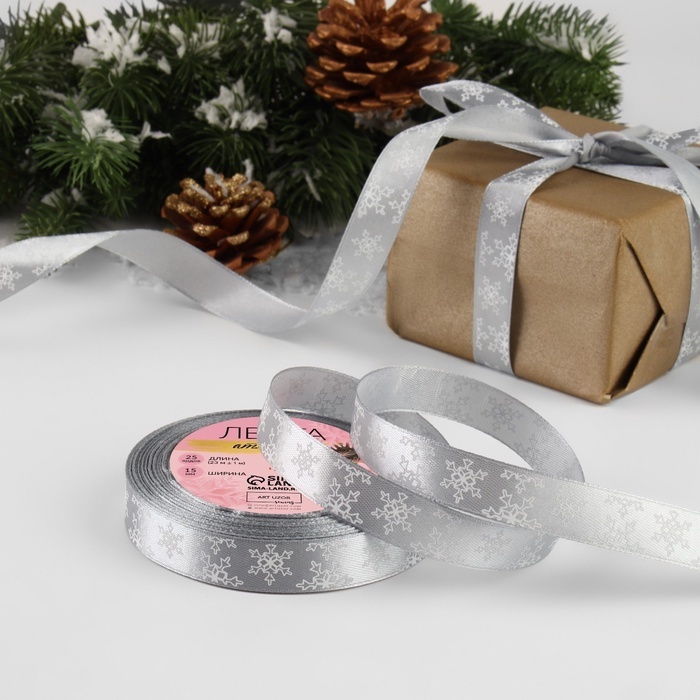 Лента атласная «Снежинки», 15 мм, 23±1 м, серая
